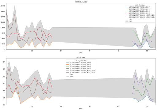 plotdf = df_re.groupby([ 'retail_item',df_re['date'].dt.year,df_re['date'].dt.week]).agg({'number_of_ads':'sum','price_gap':'mean'}).unstack().T