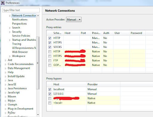 Then, you don't nee to restart your eclipse, and you will see the Provider for the bypassedlocalhost and 127.0.0.1 has changed to Native now as shown below: